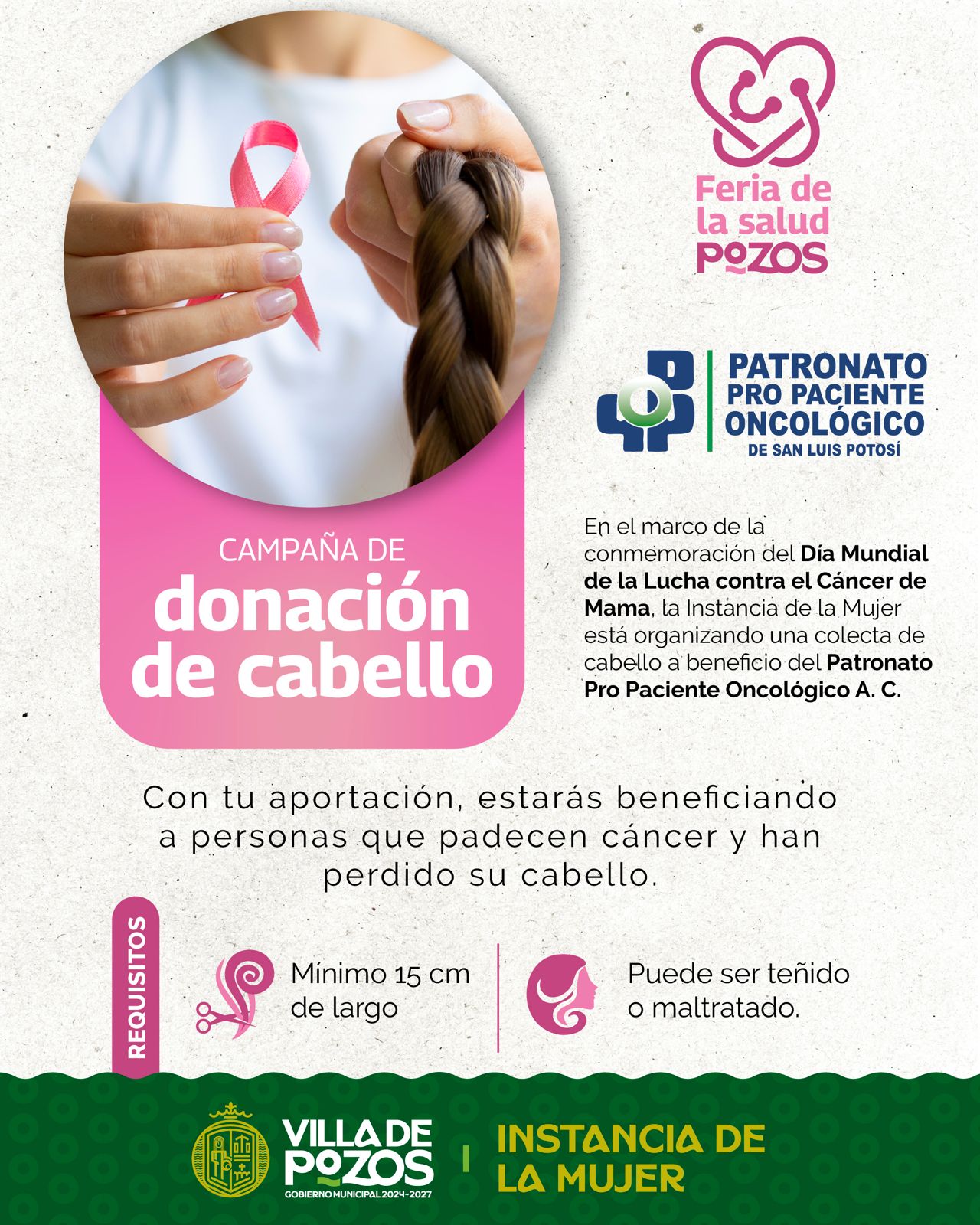 En el marco del Mes Rosa, el Gobierno Municipal de Villa de Pozos, a través de la Instancia de la Mujer, realizará una colecta de donaciones de cabello a beneficio del Patronato Pro Paciente Oncológico A.C. el próximo 22 de octubre en la plaza principal del municipio, en un horario de 10:00 a 14:00 horas, con el propósito de involucrar a la ciudadanía en una causa solidaria que busca brindar apoyo emocional y material a mujeres que enfrentan el cáncer.