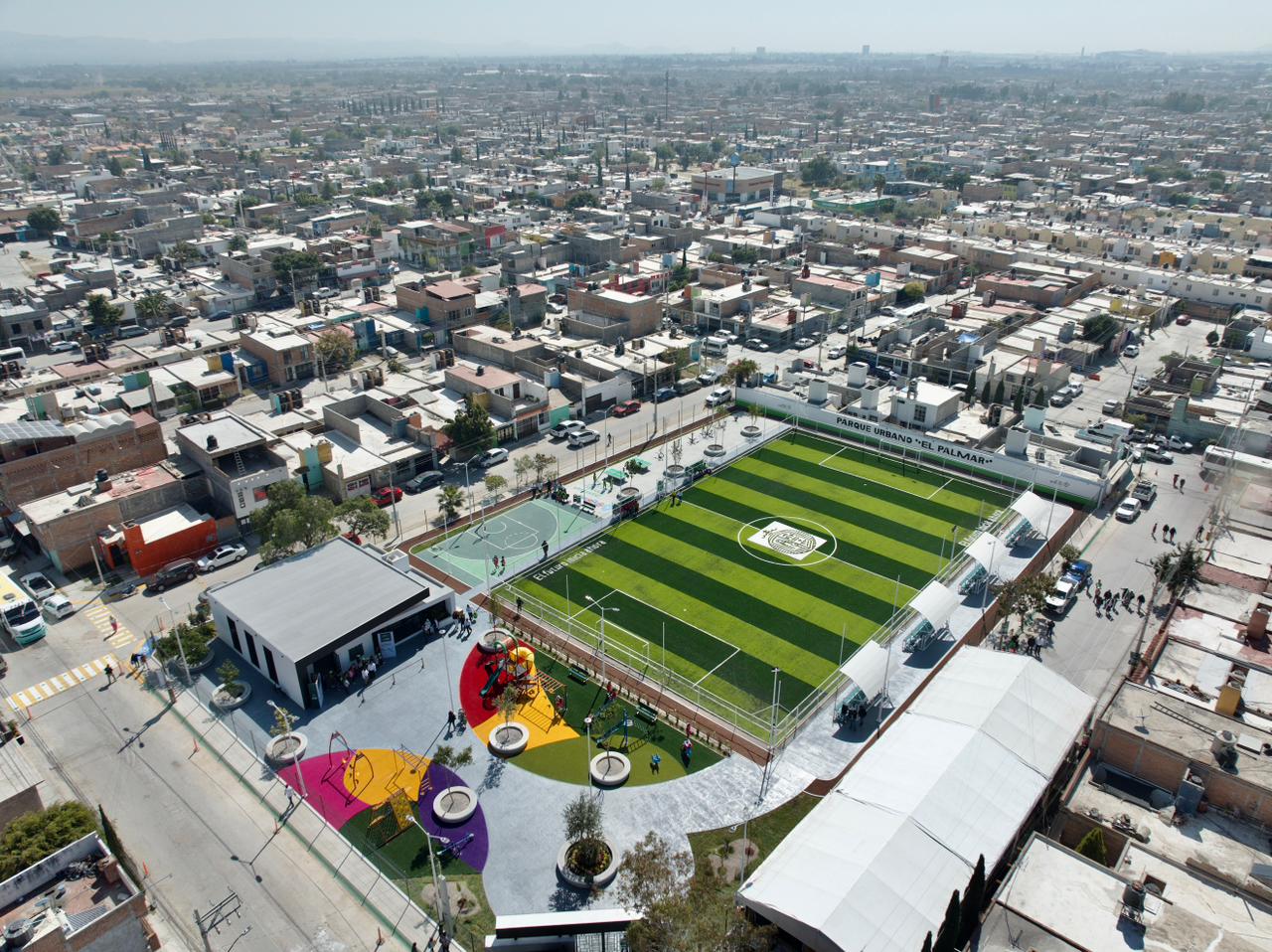 En un ambiente de fiesta, Ricardo Gallardo acompañado de niñas, niños y deportistas, inauguró la Unidad Recreativa El Palmar, con áreas deportivas, un salón de usos múltiples, canchas de fútbol con pasto sintético, gimnasio al aire libre, área infantil, explanada cívica, sanitarios, alumbrado nocturno y jardines, donde dio el penalti inicial en medio del agradecimiento de las familias.