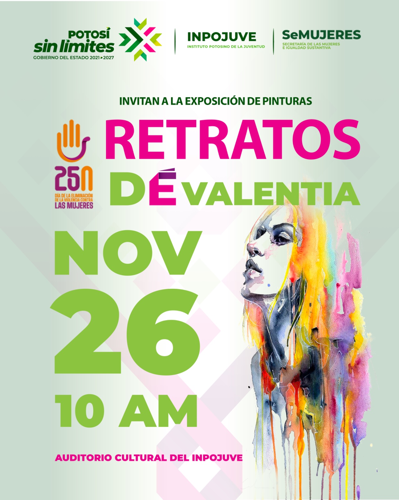 Además, para seguir promoviendo las políticas de cero tolerancias a la violencia contra las mujeres, de prevención y protección a las potosinas el 26 de noviembre a las 10:00 horas, se presentará la exposición pictórica “Retratos de valentía” de la artista Miriam Moreno Castillo en el auditorio cultural del Inpojuve.
