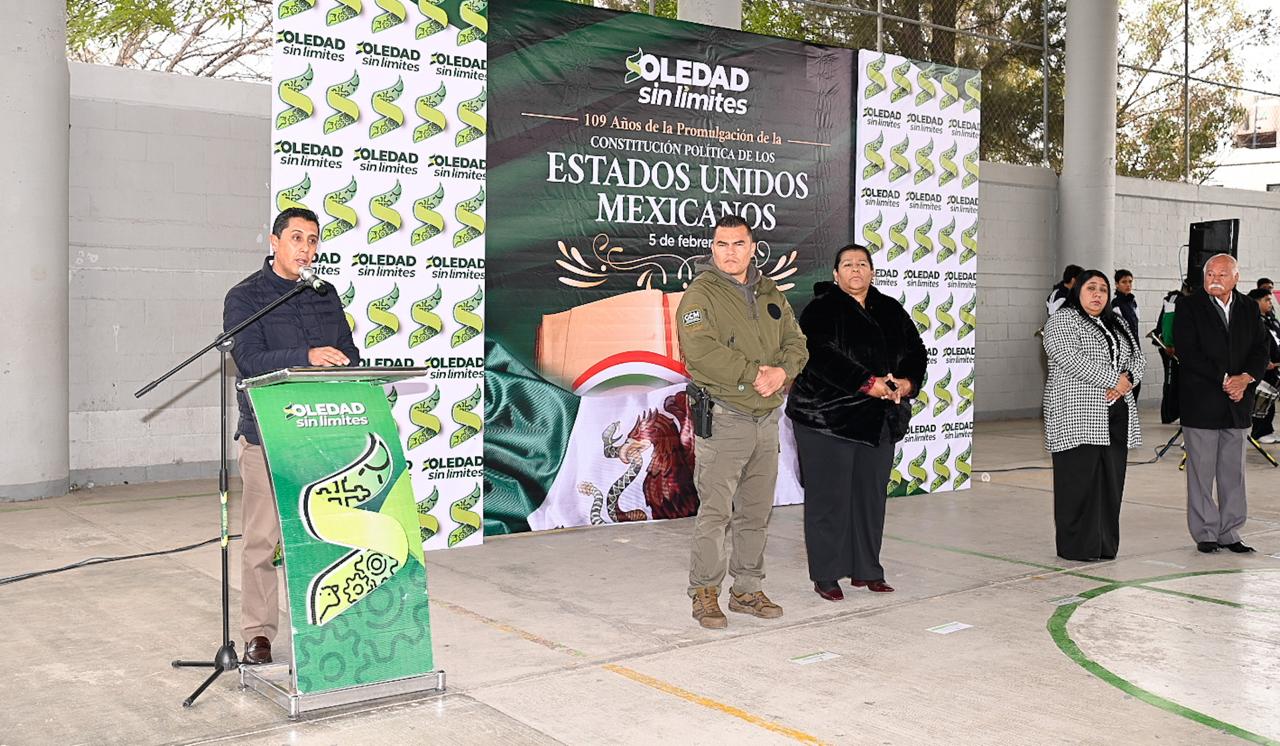 En un ejercicio de identidad nacional y cercanía con la comunidad educativa, el Ayuntamiento de Soledad de Graciano Sánchez conmemoró, este jueves 5 de febrero, el 109 aniversario de la promulgación de la Constitución Política de México de 1917, mediante un acto cívico y Honores a la Bandera en la escuela Secundaria “Ignacio Manuel Altamirano”, en la colonia Las Palmas, encabezado por el Secretario General del Ayuntamiento, Benjamín Pérez Álvarez, en representación del Alcalde Juan Manuel Navarro Muñiz, reafirmando el compromiso institucional de escuchar, atender y estar cerca de las familias y juventudes.